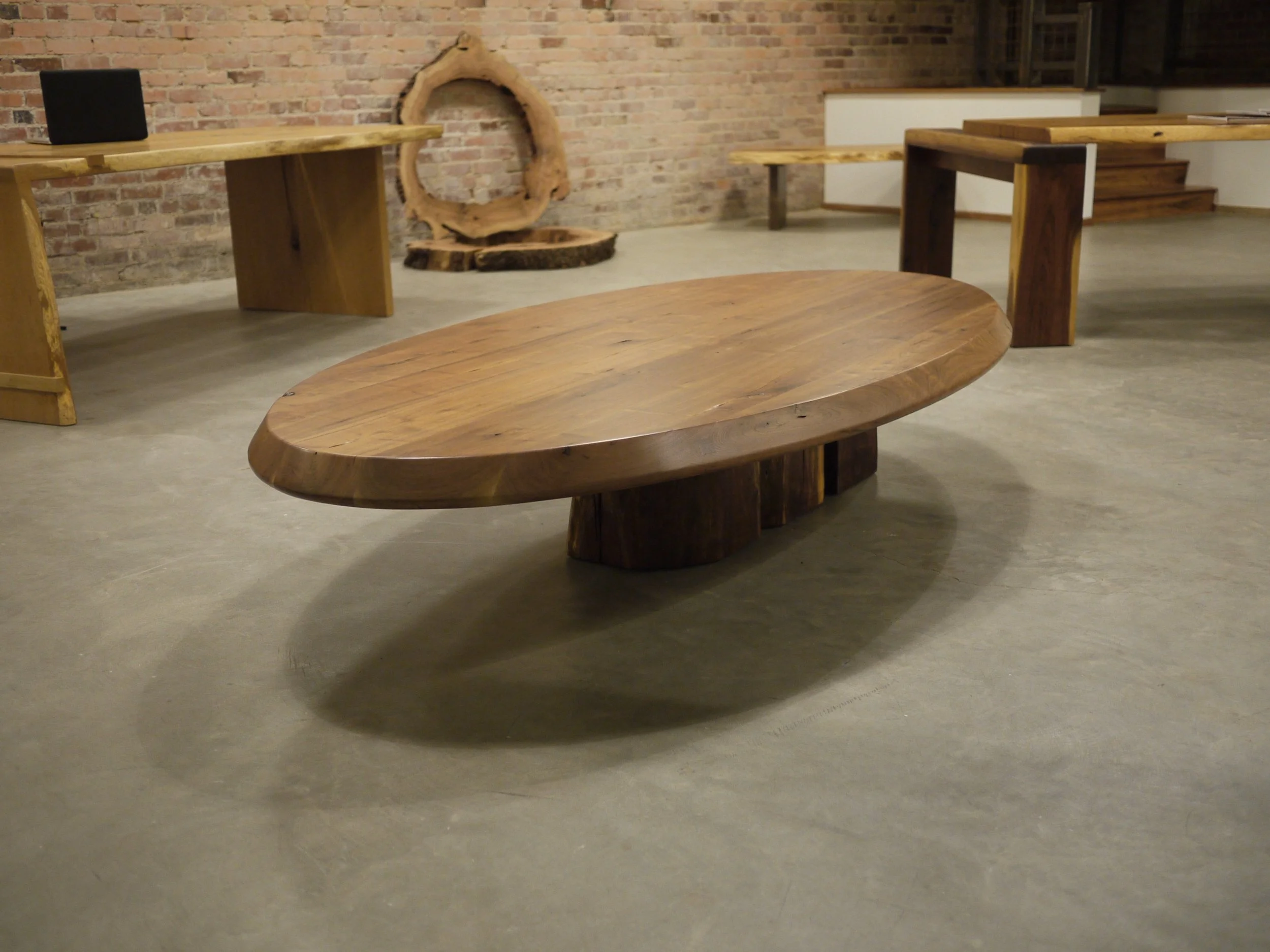 The Rosenbaum Table is a new offering from Robin Wade Furniture. Inspired by Frank Lloyd Wright's Usonian style Rosenbaum House, this hand crafted, solid walnut, elliptic coffee table was created over a decade ago. Crafted entirely from locally sourced walnut trees, this table has been on display at the Rosenbaum House Museum for the past ten years. Frank Lloyd Wright's use of cantilevers in the Rosenbaum House served as the inspiration behind this stately piece. The Rosenbaum Table sits on a cantilevered base, and was inspired by the home's cantilevered entryway.